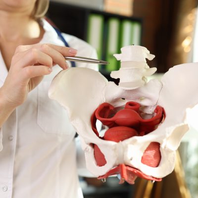 Gynecologist doctor holds model of bones of pelvic floor and anatomy of uterus. Female reproductive system and treatment of diseases in women.